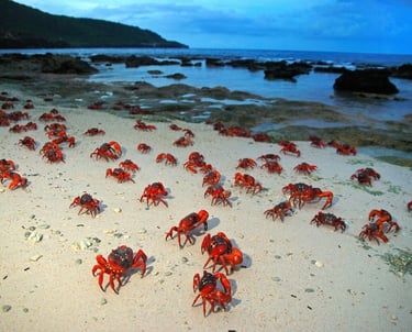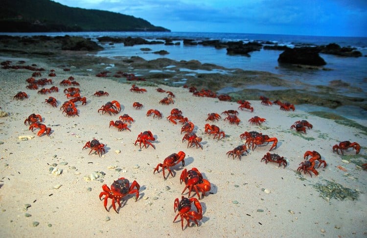 Every year, the beaches and roads of Christmas Island turn into a crimson carpet when more than 50M crabs migrate from their jungle homes down to the sea to lay their eggs.