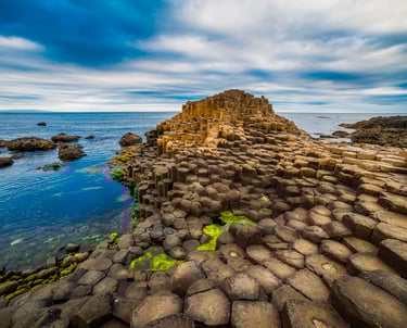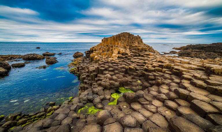 The Giant Causeway was made of tall stone columns that look like they have been hammered into place.
